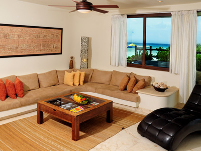 The living room has curved windows facing the beach plus two large sliding glass doors leading out to the private terrace. The terrace also has lounge chairs and offers a dining table for romantic sea side dinning. Soak in your own Jacuzzi, while watching the bright tropical stars and views of Cozumel on the horizon of the sea. Master bedroom and 2nd bedroom have king-sized beds, 2nd bedroom can be set up with 2 twin beds or a king-sized bed.